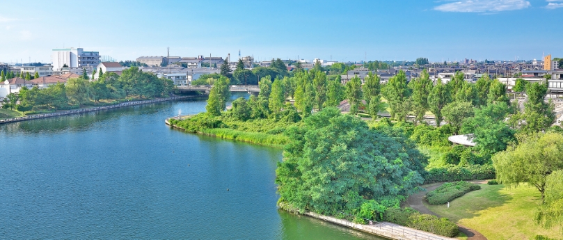富岩運河を囲むように広がる、面積9.7haの広大な親水文化公園。芝生広場や噴水公園を備えた園内からは立山連峰を望むことができるなど、市内きってのビュースポットとしても知られる。